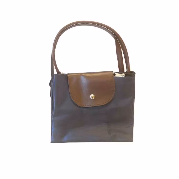 Tygväska i nylon med bruna handtag i konstskinn. Väskan är plastad på insidan så att den inte blir blöt när det regnar.