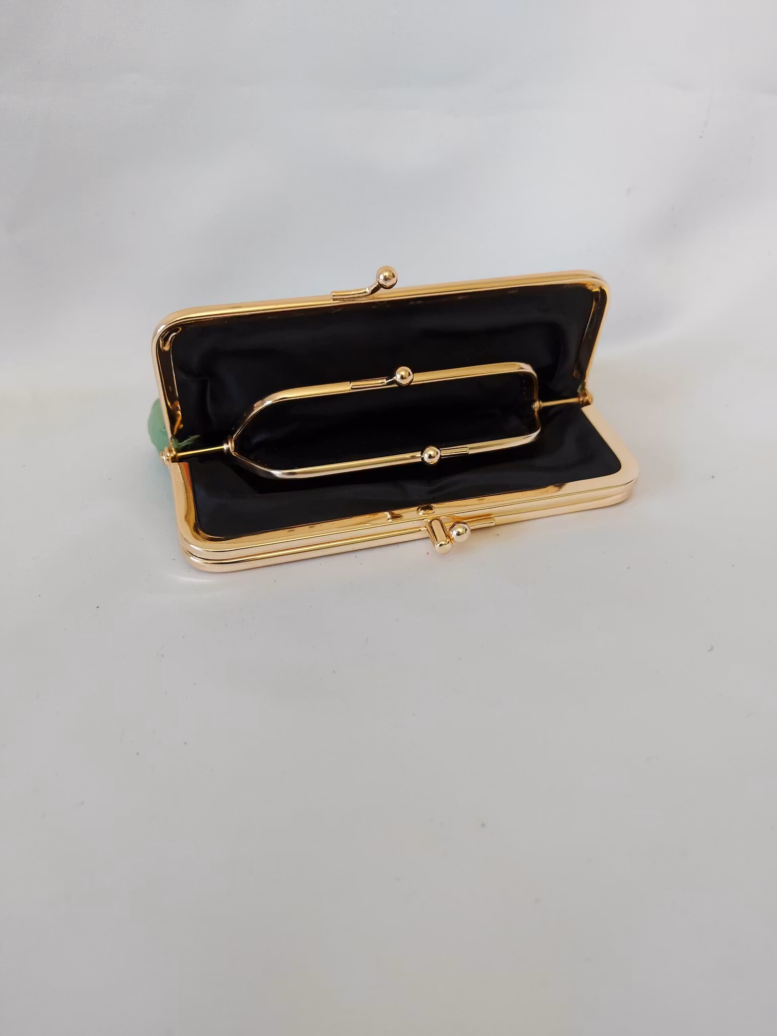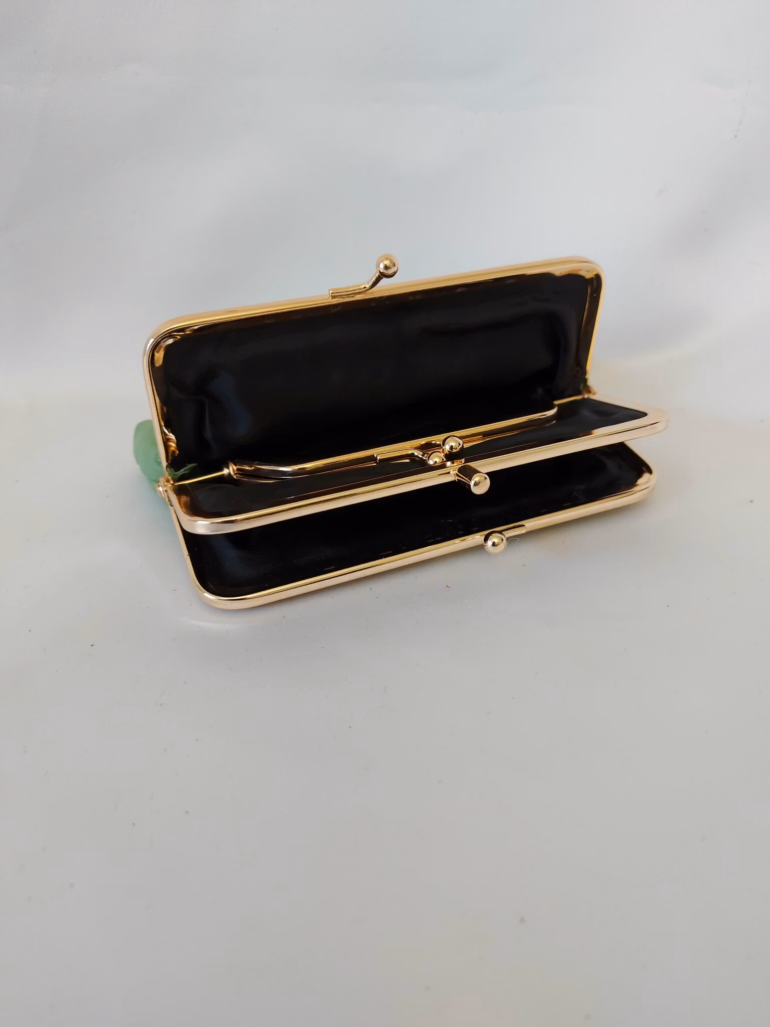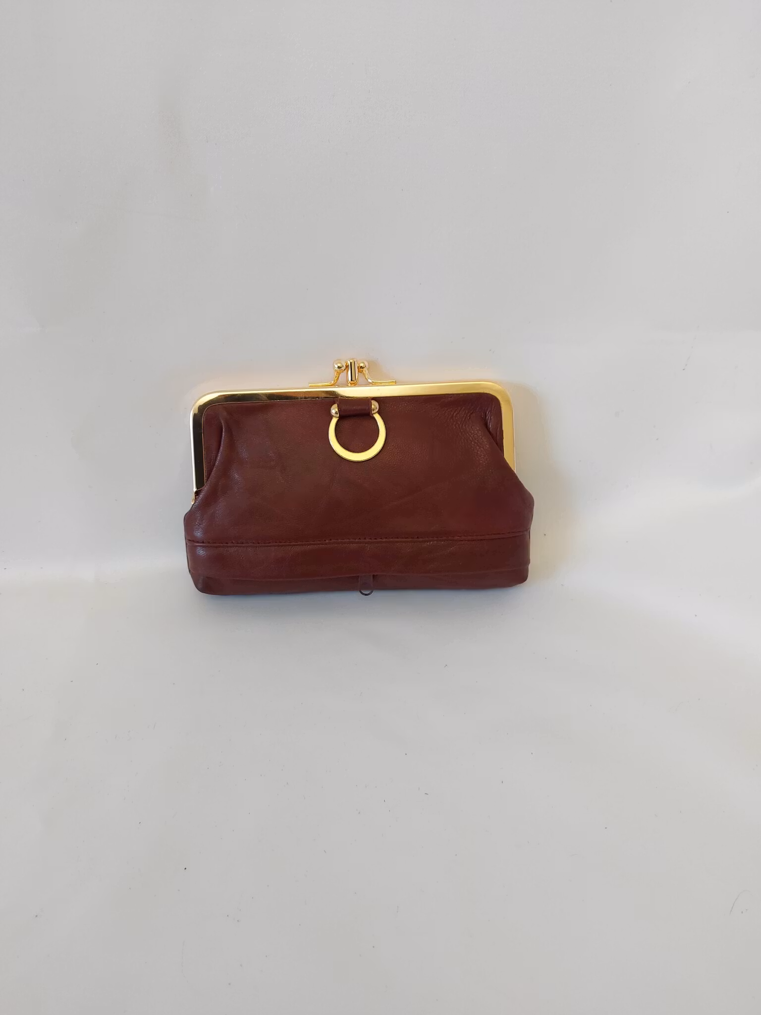Bygelbörs i skinn, platt modell med gulddetaljer, bygel=14 cm.