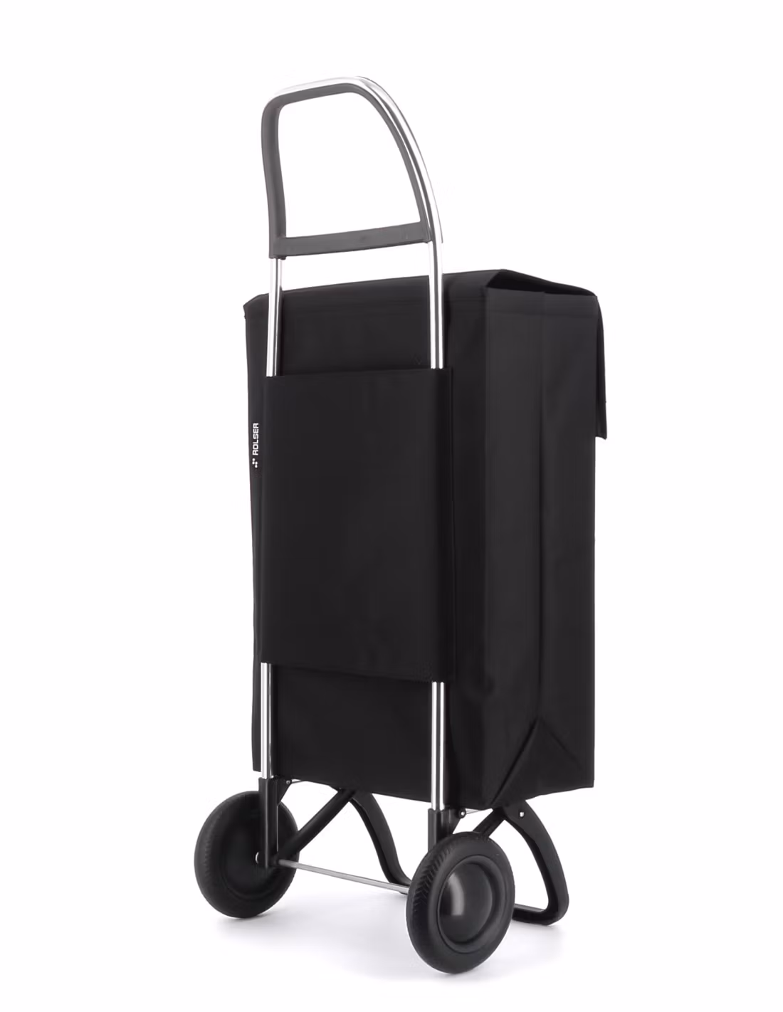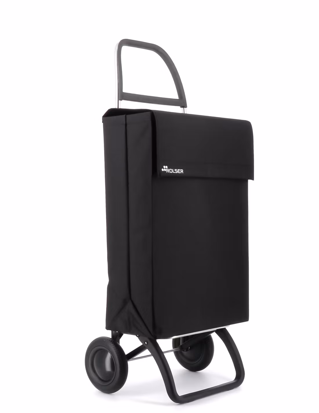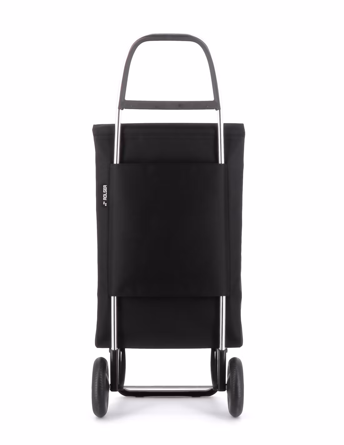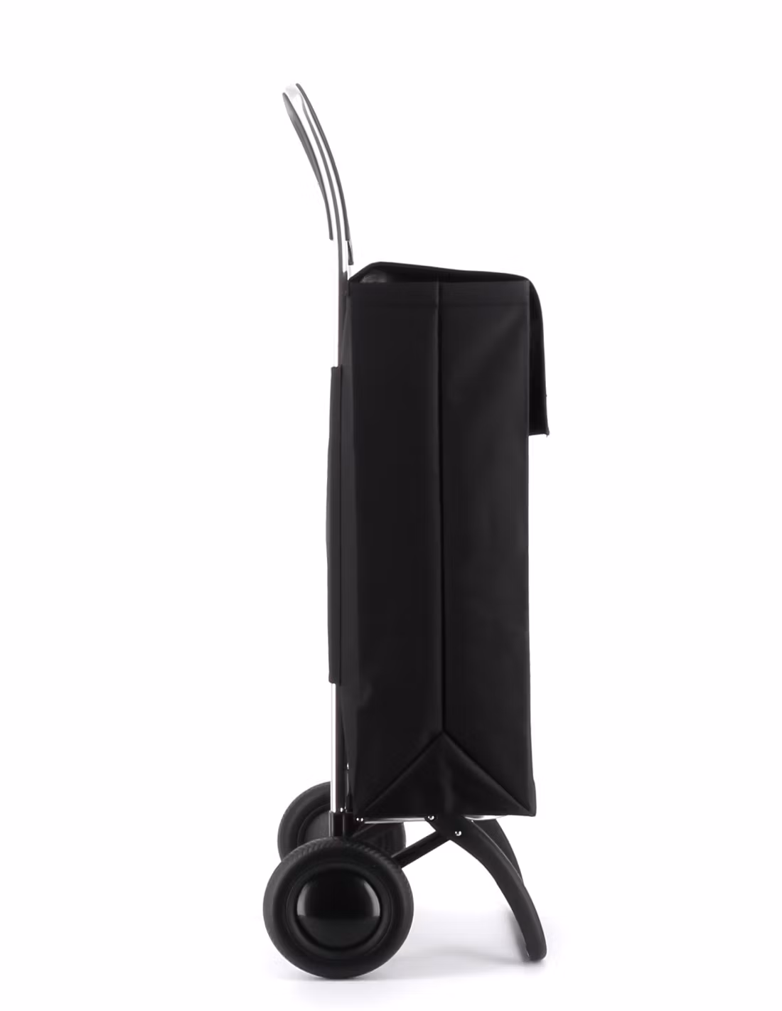 Mycket packvänlig väska som har en tunn stålram som gör att väskan håller sin fyrkantiga form. Vagnen är lätt att stuva undan när du inte använder den eftersom nederdelen än infällbar. 2 stora hjul som går tyst och stadigt på de flesta underlag som grus eller kullersten. Väskan stängs med lock och kardborre, ett litet fack inuti, inga utvändiga fack. Väskan går enkelt att ta loss om du vill använda chassit som pirra, den tåler 25 kilo, max 50 kilo. Upptill på väskan finns 2 flärpar på vardera sida som gör att väskan kan fällas ihop och ligga platt mot chassit, se bild 3, då hänger locket längre ner men fortfarande fast med kardborre. På bild 3 ser du också små öronlappar som du kan vika ut så det inte regnar in i vagnen. Klassisk eller avantgardistisk modell av shoppingvagn. Tyget LN är lagom tunt utan att vara prassligt och väldigt tåligt samt lätt att rengöra, torka av med fuktig trasa.