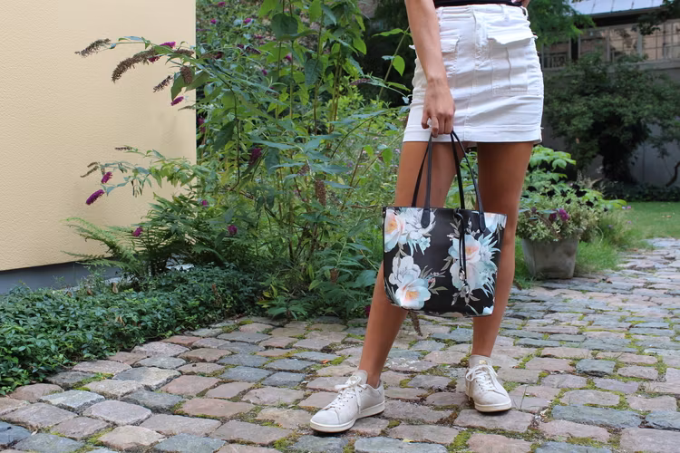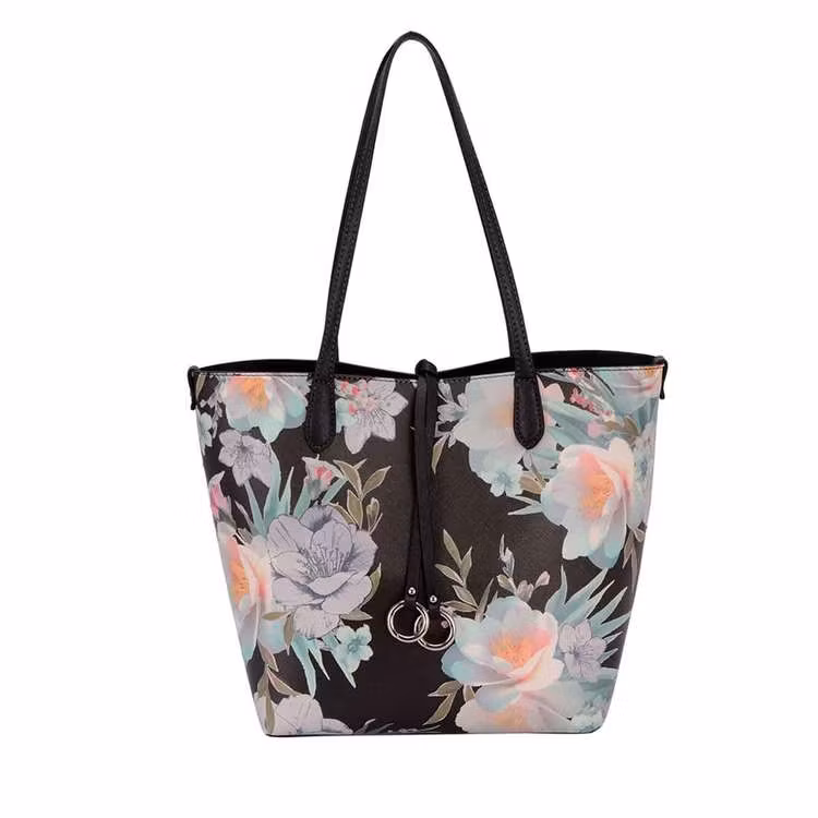 Axelväska i konstskinn svart med blommor och silverdetaljer. Väskan är öppen och det finns en innerväska som stängs med dragkedja. Innerväskan har ett fack med dragkedja på insidan. Bredd upptill 36 cm nertill 25 cm. Höjd 27 cm bottendjup 12 cm.