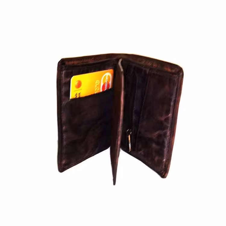 Tuff liten herrplånbok utan myntfack i mjukt vintage skinn mörkbrun med 6 kortfack och 2 sedelfack. Myntfack med dragkedja. Italienskt kalvskinn. Mått 8,5*11 cm