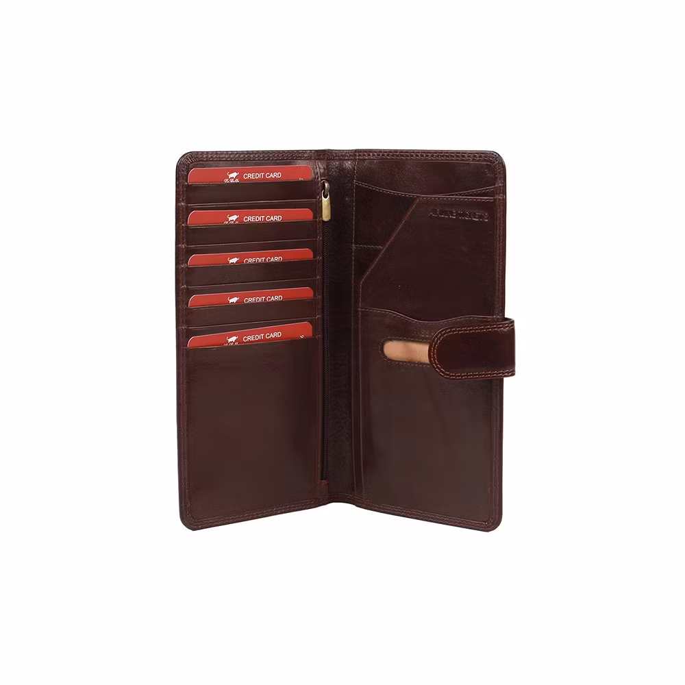 9 kortfack, fack med dragkedja. 5 fack för pass, sedlar eller biljetter. Reseplånboken stängs med tryckknapp.Mått 22,5*12 cm.