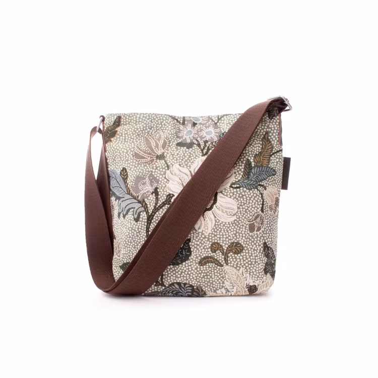 Inuti är axelväskan fodrad med ett matt brunt bomullstyg.