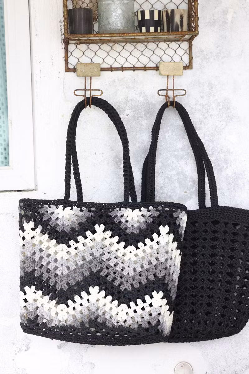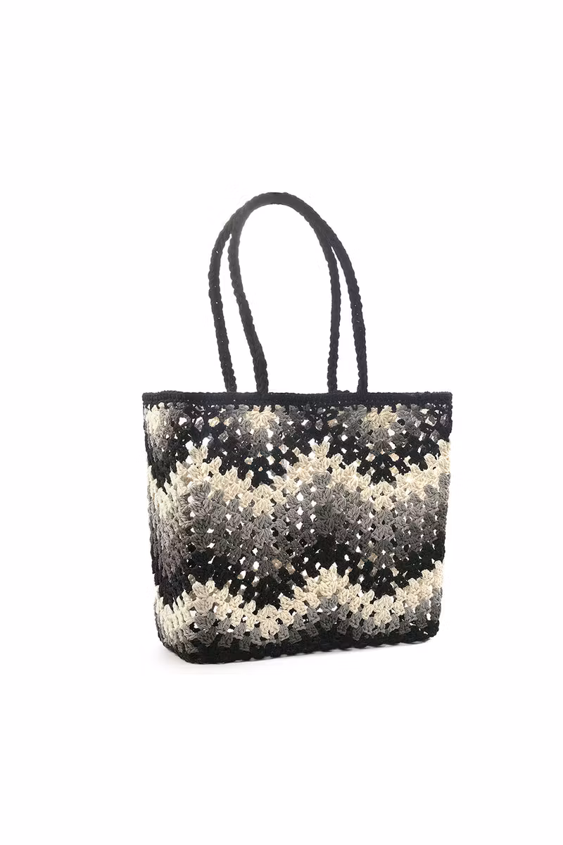 Crochet Basket är en virkad korgväska i vackert bomulls/polyester material. Väskan är grafiskt mönstrad i toner från svart till vitt i ett vågmönster.