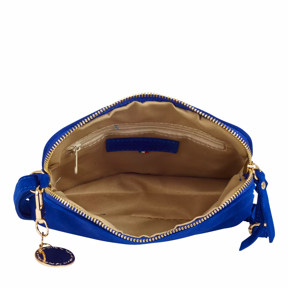 Hela väskan är i mocka (Made in Italy), botten är platt så trots sin lilla storlek ryms det en hel del.