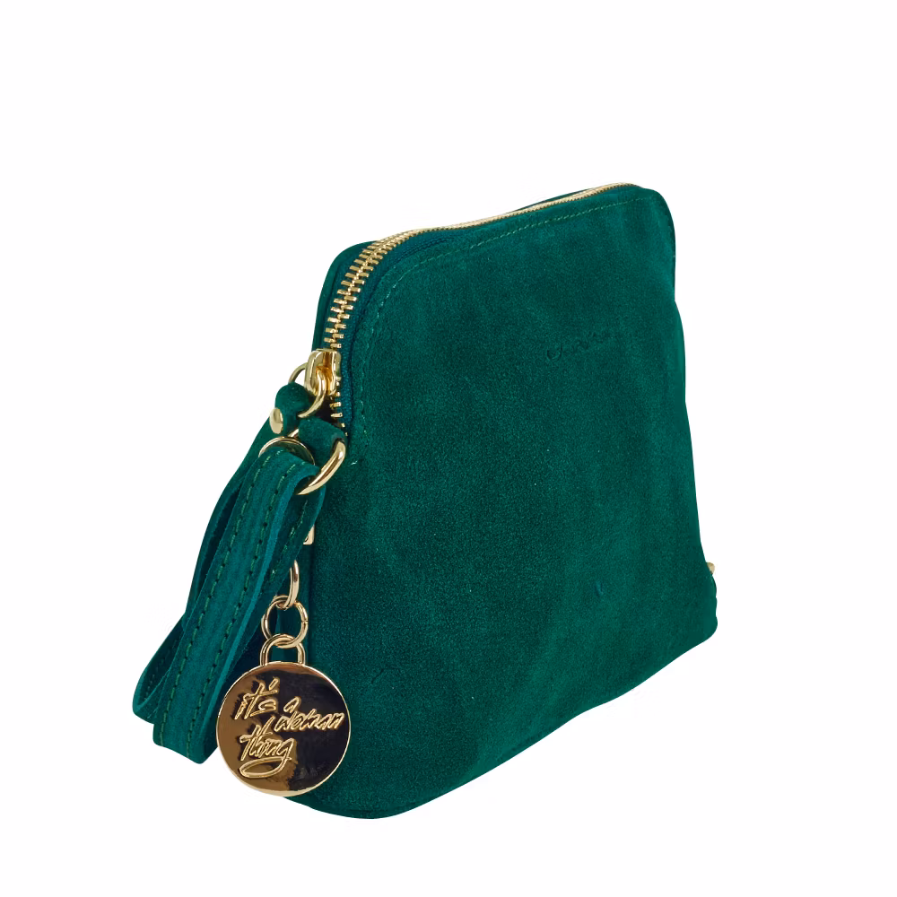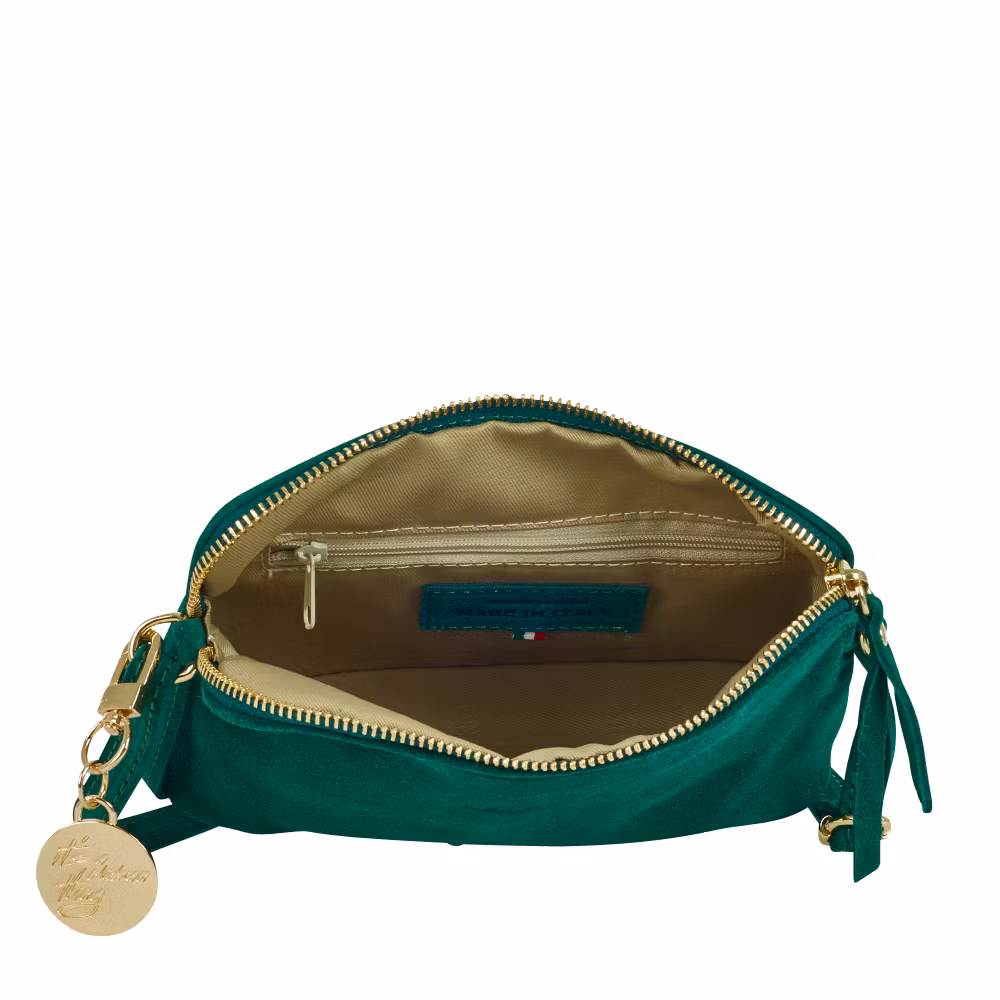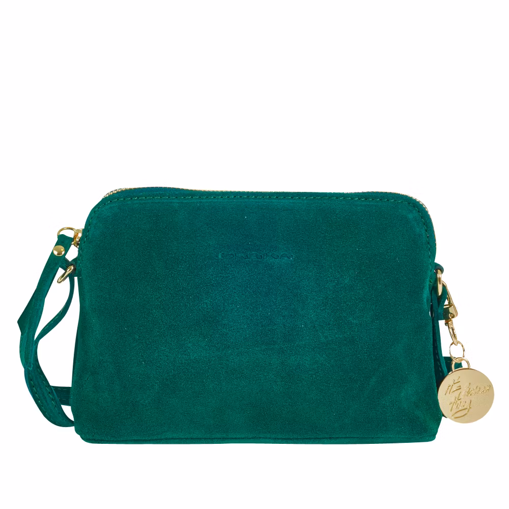 Axelremsväska i halvmåne form och mörkgrön mocka från Ulrika Design 08-7009.
