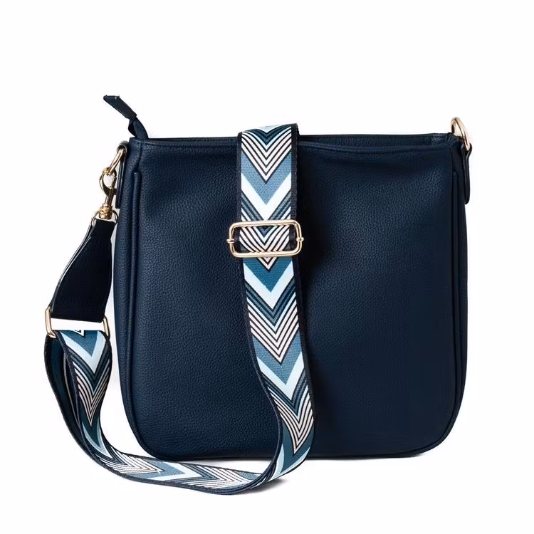 Axelväska i marinblå med matchande axelrem mönstrad i blåa toner.