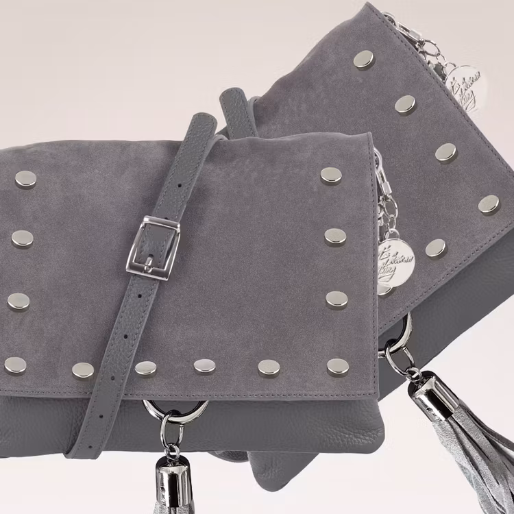 Axelväska mocka/skinn grå med tofs nitar Ulrika Design