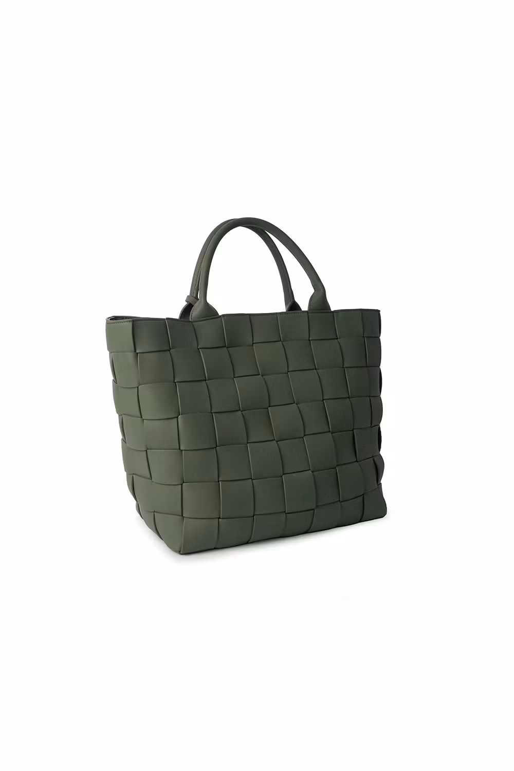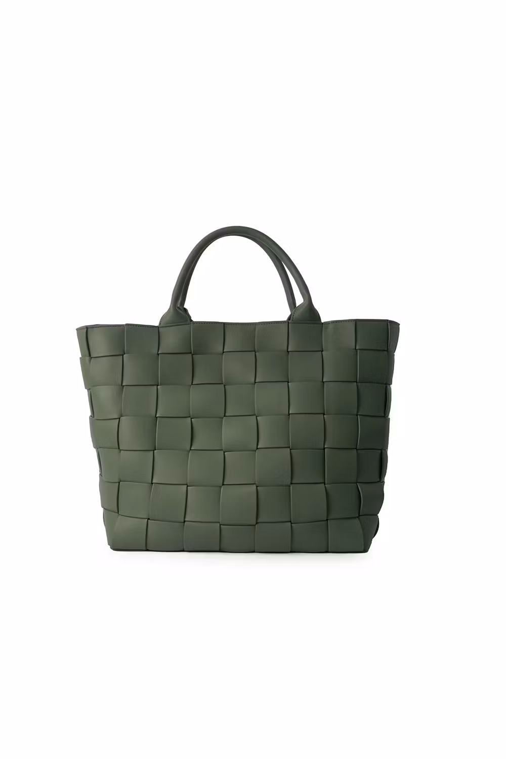 Denna väska är ett mästerverk tillverkat i högkvalitativt veganläder med ett intrikat flätat mönster som ger en exklusiv känsla. De rundsydda handtagen erbjuder optimal komfort när du bär dina vardagsessentiella saker, oavsett om det är genom stadens myller eller till kontoret.