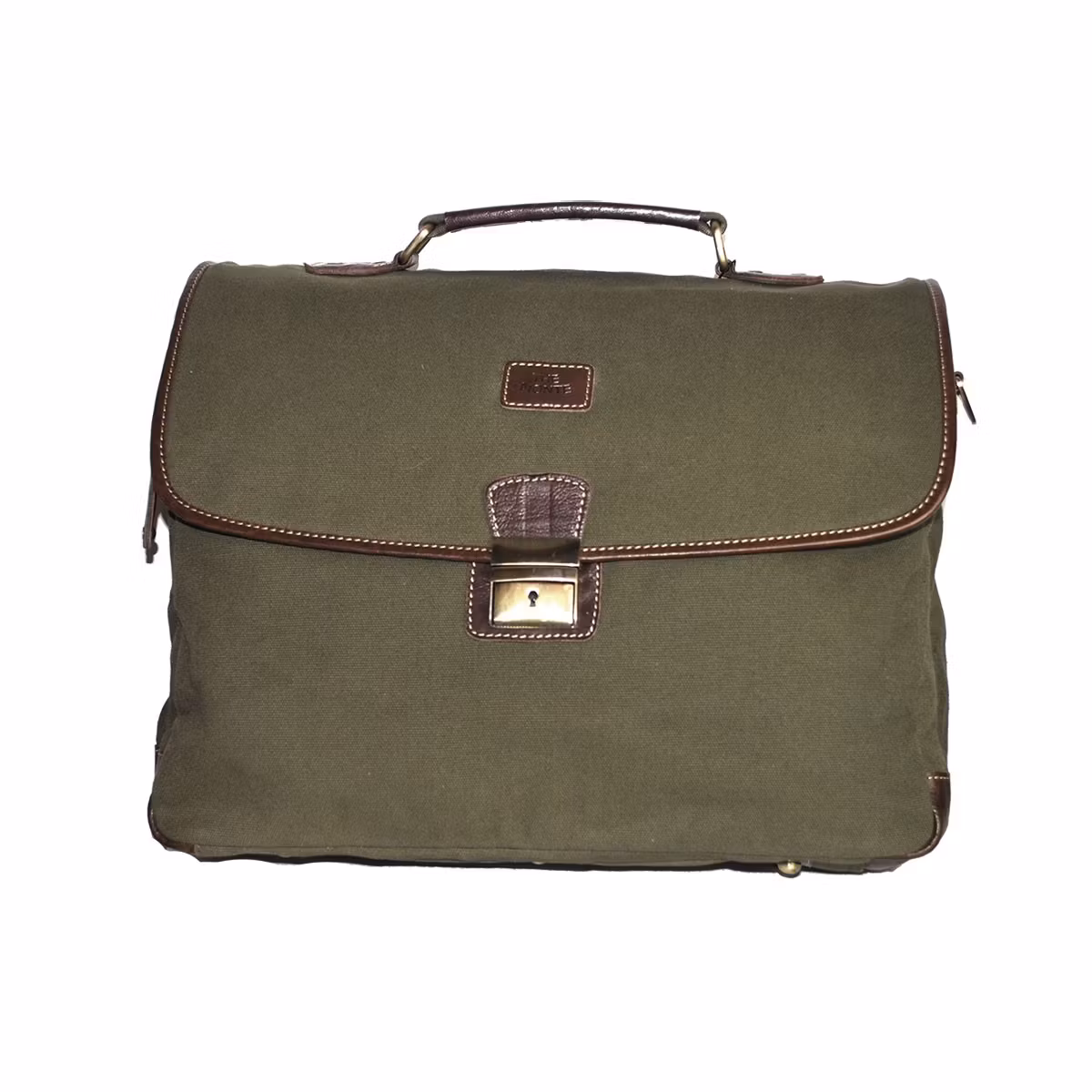 Portfölj kahkigrön canvas med bruna läderdetaljer The Monte