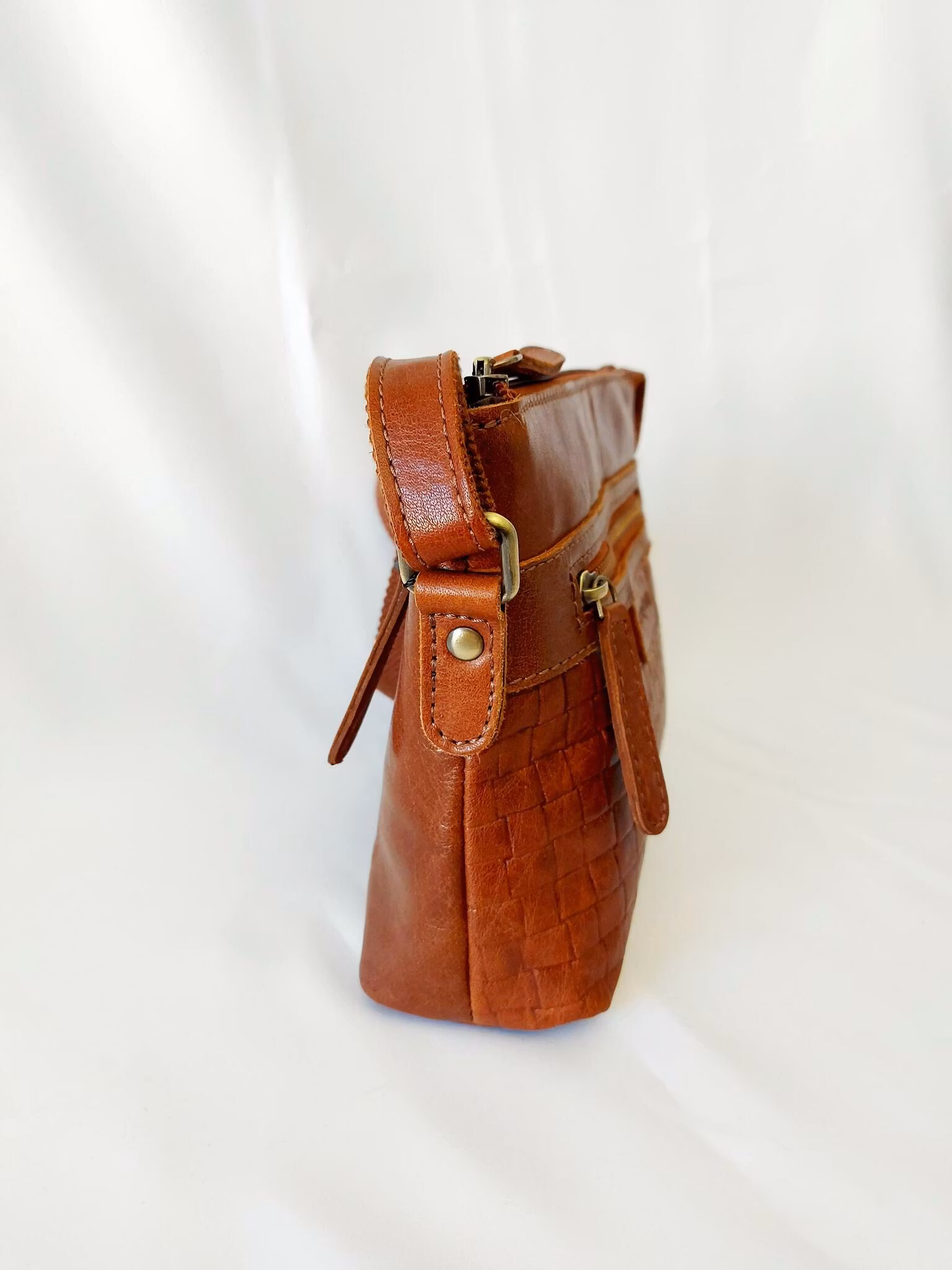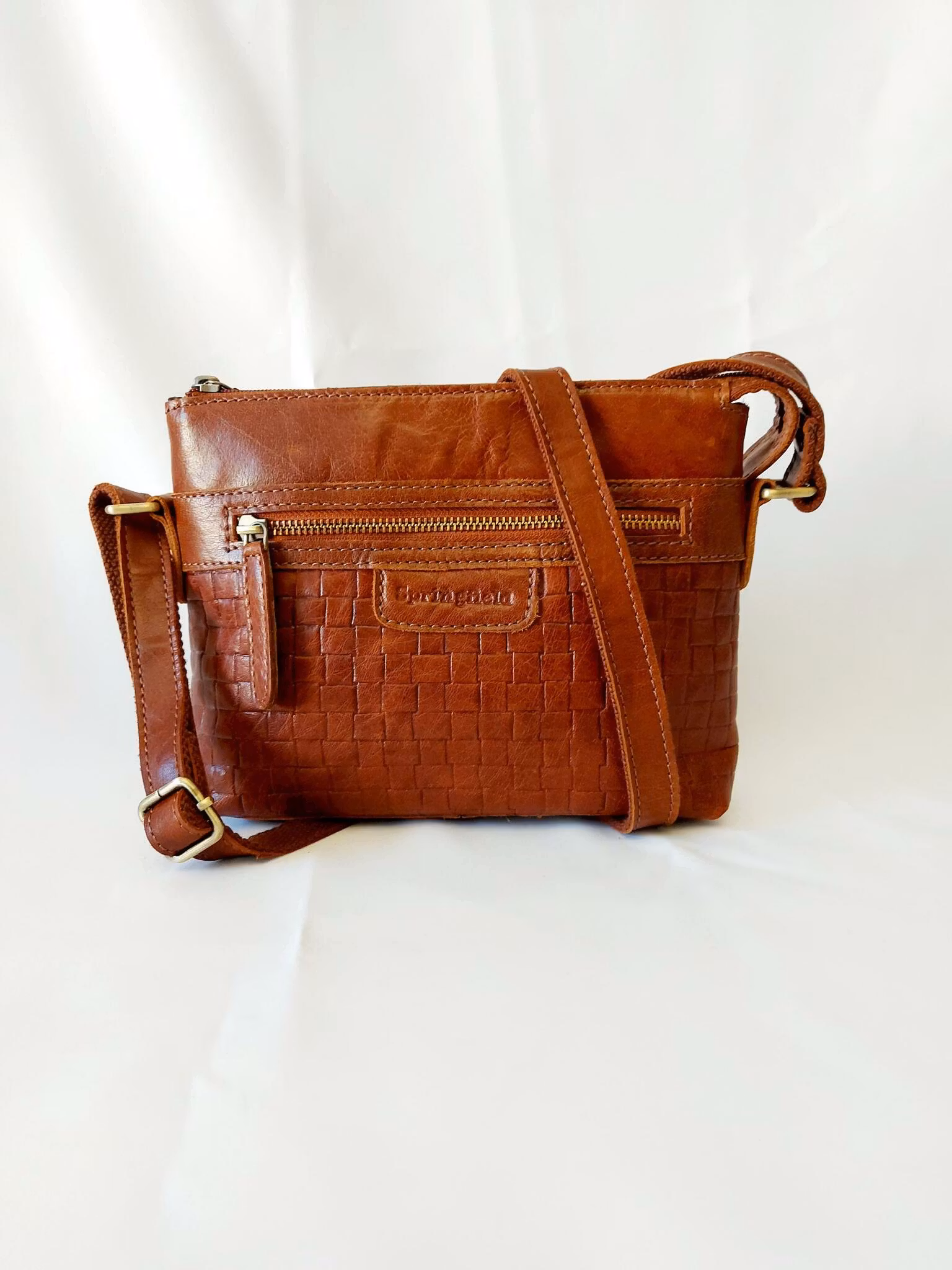 En äkta skinnväska med fint flätat mönster på framsidan. Mönstret är präglat i skinnet.