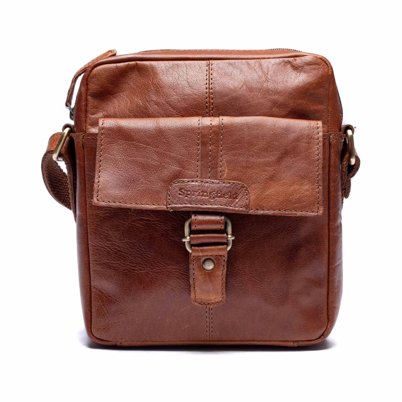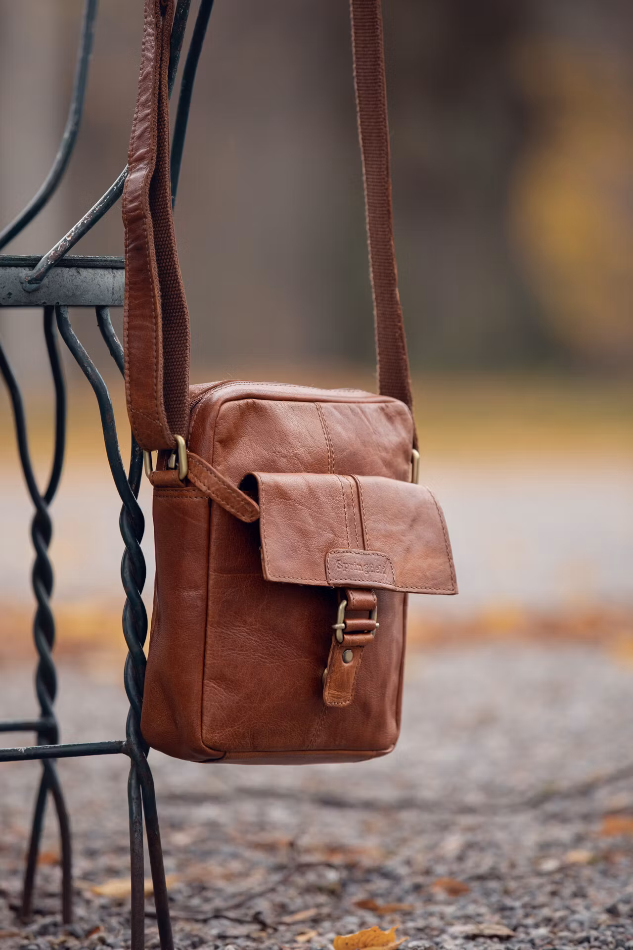 Tuff liten axelväska i äkta läder som passar både kvinnor och män. Väskan stängs med dragkedja.